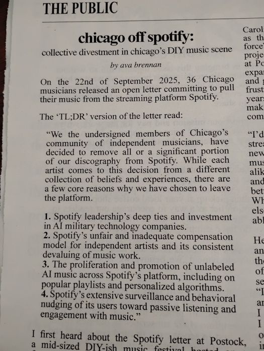 Another piece detailed how some Chicago musicians are leaving Spotify.