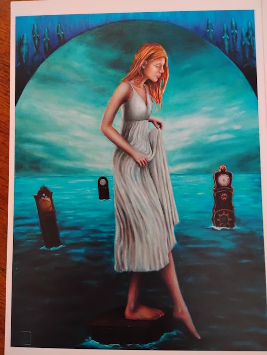 I love the shades of blue used here. Plus pretty ladies are always nice. And it's a neat surreal scene of handless clocks floating like buoys in the open water. I am unsure what the whales up top above the arch are meant to represent or make the viewer contemplate.