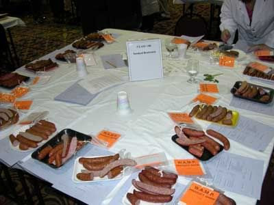The smell was absolutely mouth-watering! There were a couple dozen folks clad in similar lab coats to mine scattered throughout the room. Most hovered over tables whose tops were covered with packages of meat of one kind or another. Other folks were scurrying from a microwave with plate in hand to their table. Ed was judging whole muscle jerky with a gentleman named Franky from Green Bay.