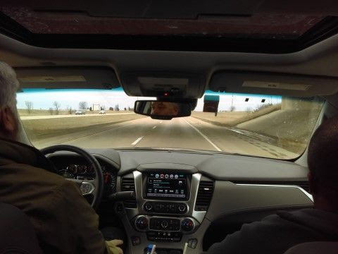 We had reserved a minivan but ended up with a giant black Suburban featuring tinted back windows. It was luxurious. The middle bench where I sat had its own climate control with vents on the ceiling a la airplanes. There were a couple displays and a Bluray player too. In addition to temperature and fan controls, the rear panel also had a USB jack and, oddly enough, RCA jacks. Apparently there are portable home electronics that don't use HDMI.