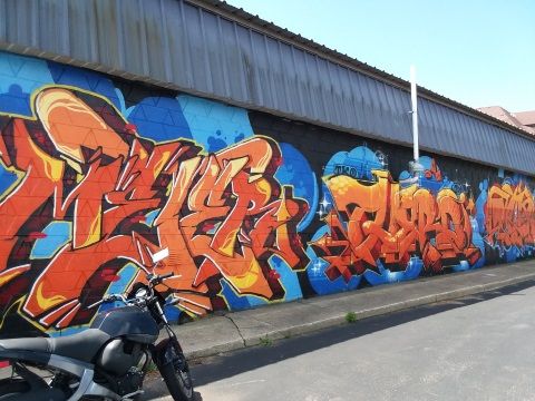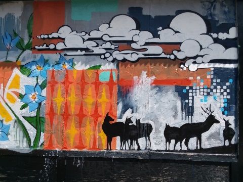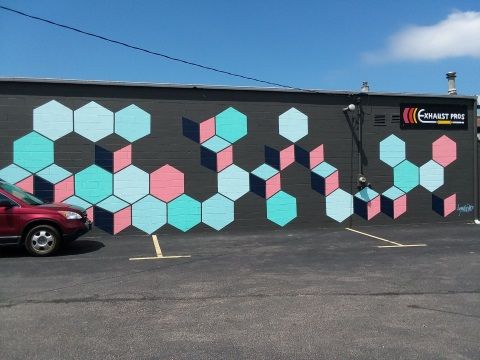 Somehow the southeast corner of the intersection of Atwood Avenue and Cottage Grove Road became mural central without me noticing. One day the art treatment on one building caught my attention and then on my next visit to Walgreens it appeared as if the murals had multiplied like rabbits because they were all over the place. The Rockwell Tattoo parlor, Java Cat, Exhaust Pros, Jade Monkey, and the mall all have all been muraled up. So here are a few of them beginning with the Exhaust Pros building which looks like it was conceived by the same person who did the Karben4 logo while they were playing QBert.