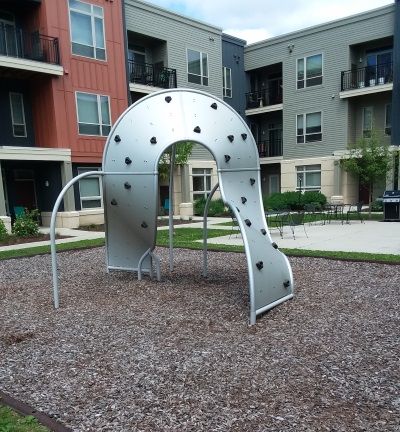 Just across Royster Oaks Drive are the Pinney Lane Apartments, another complex with low-income housing. I hadn't noticed the artwork/plaything in the courtyard previously It's like a Möbius strip that has been cut.