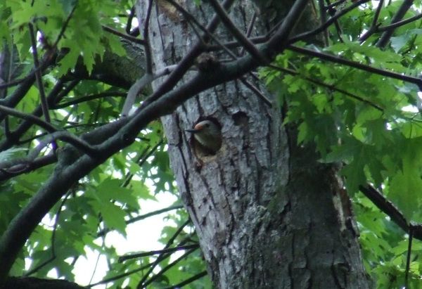 The woodpecker at the other side of the yard was peeking out and perhaps contemplating its day.