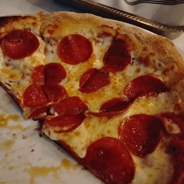 The pizza was mighty fine. High marks for the generous application of pepperoni and I only wished that it was been a bit more well-done. Brown that cheese! I take that back. Brown the cheese and sprinkle some herbs on there.