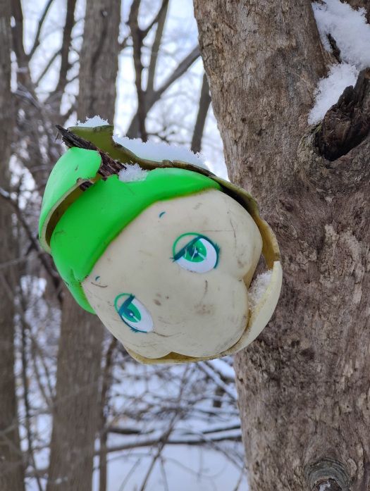 I eventually found the area that had had dolls, a beer bottle, and so on hanging from branches. Barbie had fled and all that was left was the head of a turtle from a plush thingy that had been whole on my last visit.