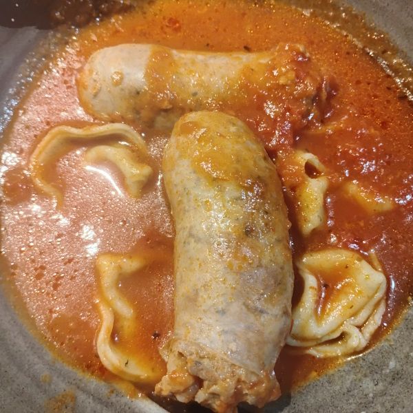 Earlier this month I got the craving for Italian food. I suspect I just didn't get enough at my Italian uncle's home over Christmas. A stop at the Willy Street Coop yielded some smoked mozzerella tortelloni from RP's Pasta. Next I made a trek to Fraboni's as I had a hankering for their XX hot sausage.