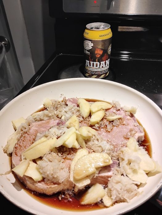 Into the pan along with the mass-produced chops was my last Winesap apple from a trek last autumn to Lapacek's Orchard, some kraut, and a generous splash of Aidan, a smoked rye oyster stout from Lakefront Brewery.