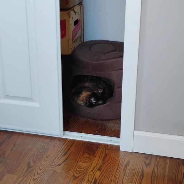 Her dishes may be in storage, but I still see them next to the refrigerator with her last supper that she never ate. Her cat house is in the garbage but I still saw her lying in it behind me today as I worked. She slept in it a lot but would come out and meow at me when I was in a virtual meeting or a call. The sound of my voice drew her out of her slumbers and I missed that dearly today.