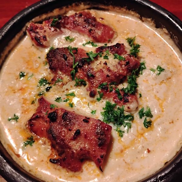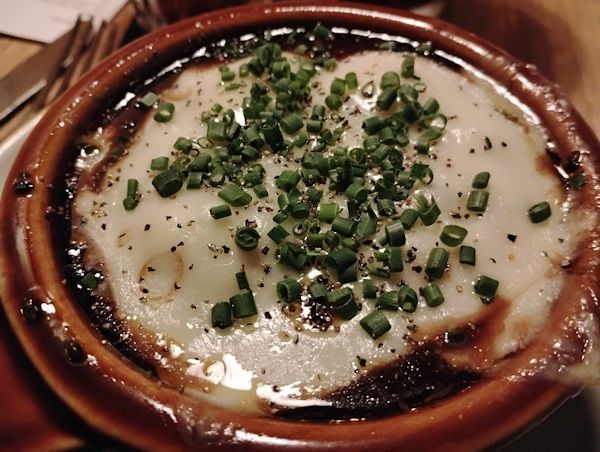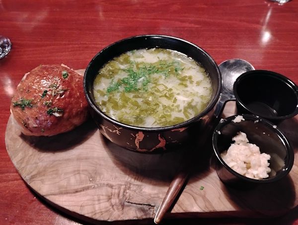 A dinner roll on one side and little cups of vinegar & diced garlic on the other. A rather generous portion of garlic too. It was all delicious but I had no idea that garlic was served with the soup and the meal ended up being a total garlic festival as I had also ordered Chkmeruli, Georgian garlic chicken.