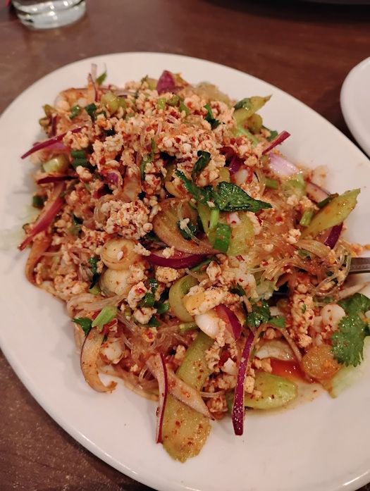 I had Crying Tiger with a medium level of spice. It is a bit like larb but the meat wasn't ground. Slices of beef mixed with green onion and cilantro. And either their medium heat level is the equivalent of high elsewhere or the cook made a little mistake because this stuff was hot. Not blazing, not deadly but I did feel it. If I'd gotten their hottest level of spice I think I would have cried. As it was, very tasty.