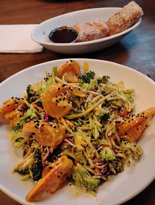 On a recent stop at the Great Dane I acutally didn't order the French onion soup and instead got a tasty salad laden with shrimp. My dining companion ordered beignets.